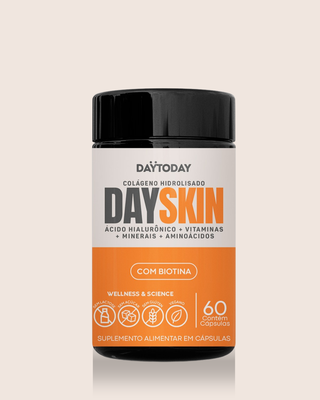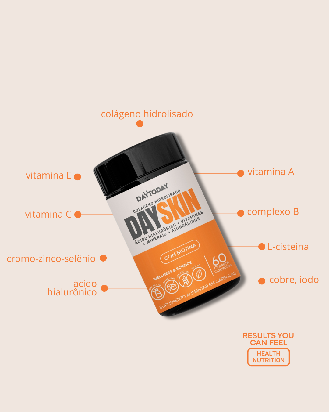 Fórmula rica em colágeno hidrolisado e ácido hialurônico que entregam um cuidado de dentro para fora com foco em hidratação, vitalidade e longevidade para a sua pele. Possui antioxidantes como vitaminas C, E, zinco, selênio e cobre — que ajudam a combater os danos causados pelos radicais livres, e auxiliam na manutenção da firmeza, do viço natural da pele e da uniformidade. A presença da vitamina A, biotina, niacina, riboflavina e iodo contribuem diretamente para a pigmentação e saúde da pele.