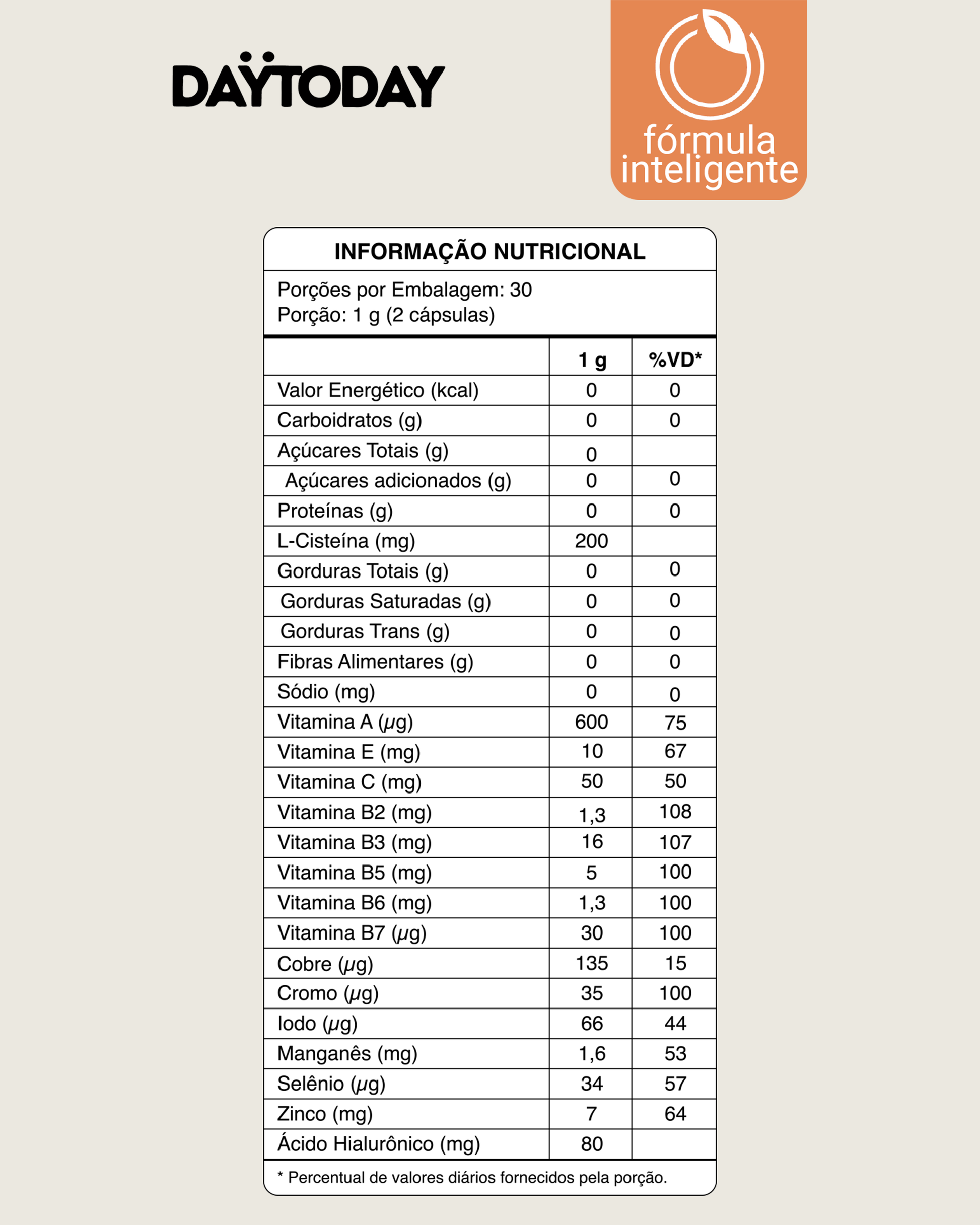 L-Cisteína, Colágeno Hidrolisado, Hialuronato de Sódio obtido pela fermentação de Streptococcus Zooepidemicus, Ácido Ascórbico, Nicotinamida, Acetato de D-Alfa-Tocoferol, Óxido de Zinco, D-Pantotenato de Cálcio, Sulfato de Manganês, Cloridrato de Piridoxina, Riboflavina, Acetato de Retinol, Sulfato Cúprico, Iodeto de Potássio, Picolinato de Cromo, Selenito de Sódio, D-Biotina, Antiumectantes Celulose em Pó, Dióxido de Silício e Estearato de Magnésio. Composição da Cápsula: Gelificante Gelatina e Corante Dióxido de Titânio. NÃO CONTÉM GLÚTEN.